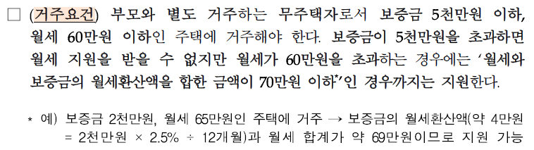 예외도 있습니다. 만약 현재 거주하고 있는 집의 보증금이 5,000만원이 넘어가면 본 사업을 신청할 수 없지만, 월세가 60만원이 넘어갈 경우에는 보증금을 월세로 환산한 뒤 월세와 합하여 70만원이 넘지 않는다면 신청이 가능합니다.